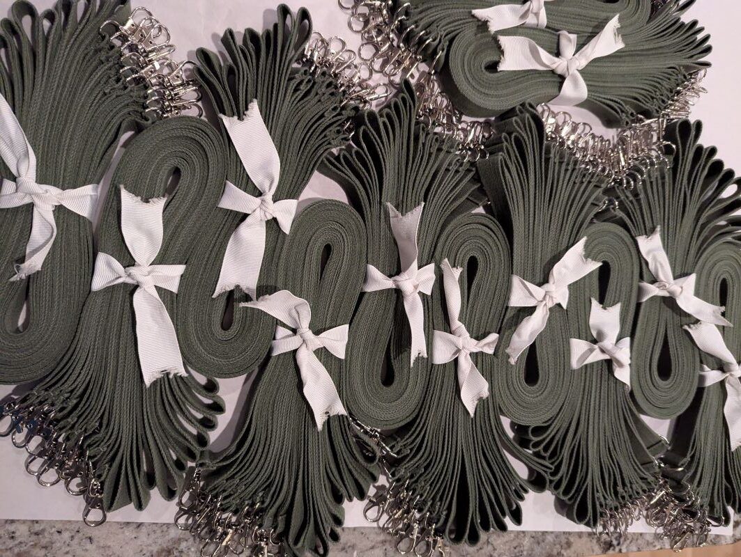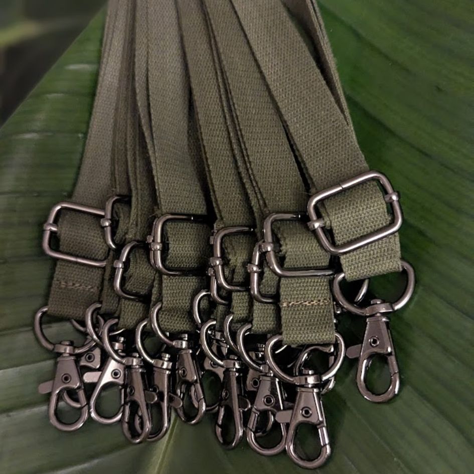 Sourced from 100-yard rolls of authentic green military webbing—complete with original federal procurement tags—these vintage materials were uncovered in our LA scrap warehouse and transformed by a small sewing shop in Indiana into a truly one-of-a-kind lanyard option. Rugged, historic, and sustainably made for modern events.