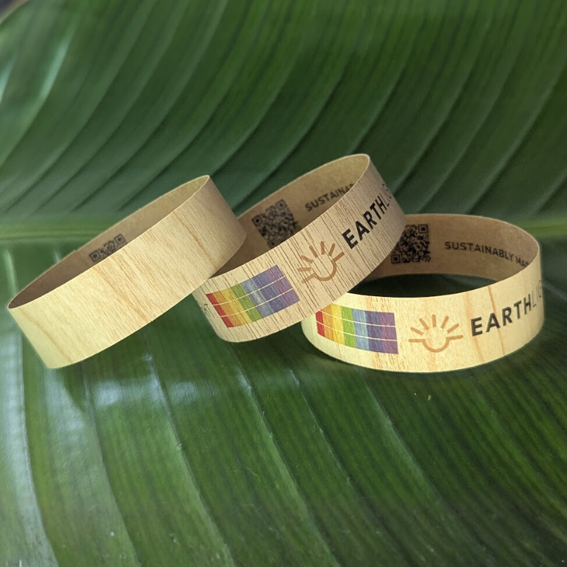 Our Wood Paper Overlay Wristbands are an FSC® Mix–certified, USA-made alternative to plastic event bands, crafted from thinly sliced real wood with a durable kraft paper backing. Available with full-color printing across five unique wood species and finished with a standard adhesive glue tab, they combine natural texture, secure wear, and standout sustainable style.
